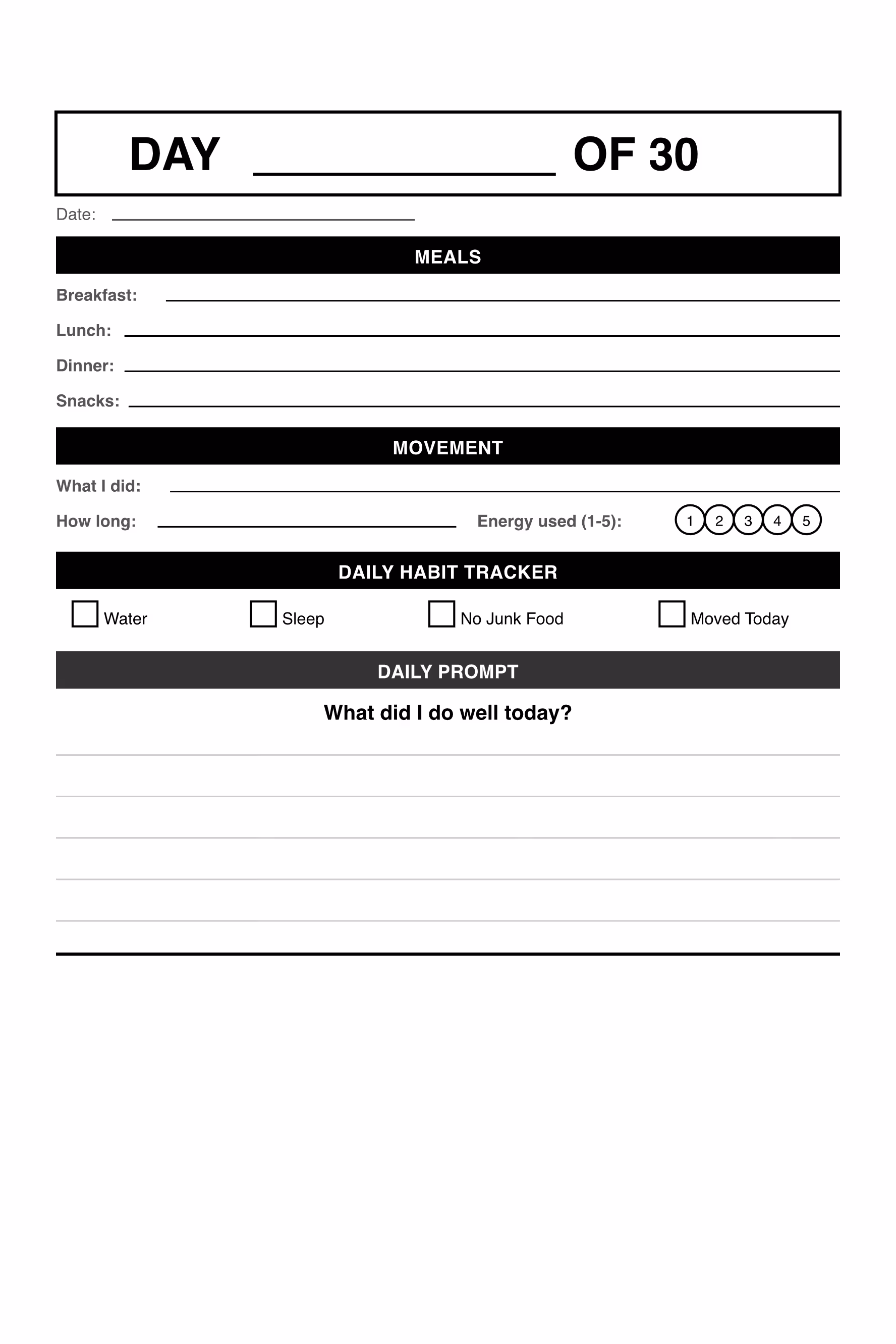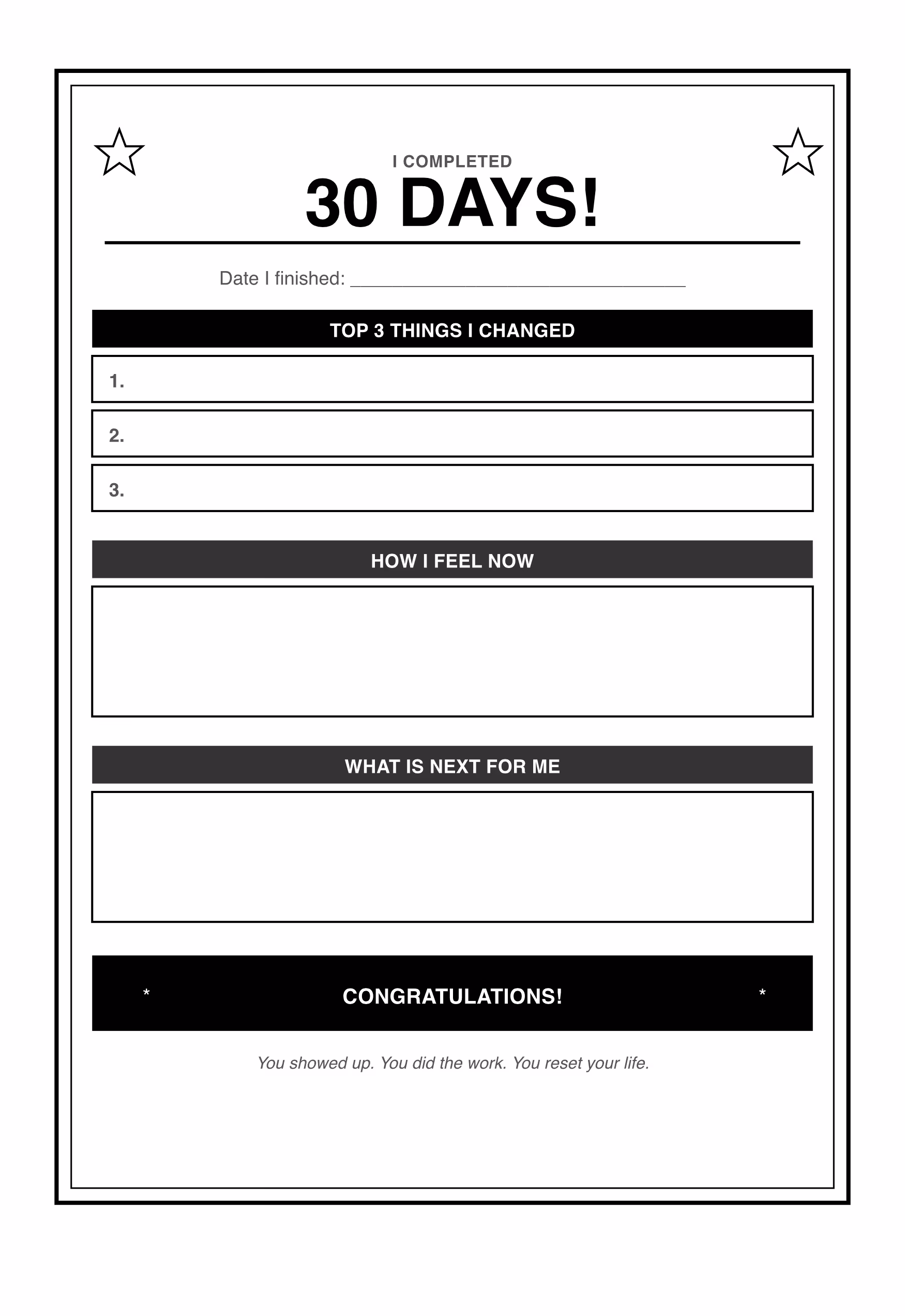 Monitor your progress with structured check-ins on days 10, 20, and 30.