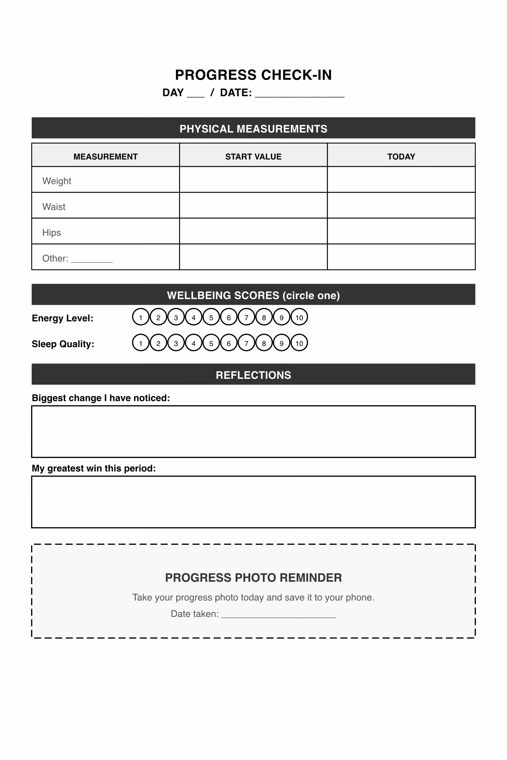 At several key points in your 30-day journey, you'll come to a Progress Check-In page. These pages are structured checkpoints where you can record your weight and measurements, rate your current energy and sleep quality, note the biggest change you've noticed so far, and there's even a photo reminder box to help you document your physical progress visually if you choose to.