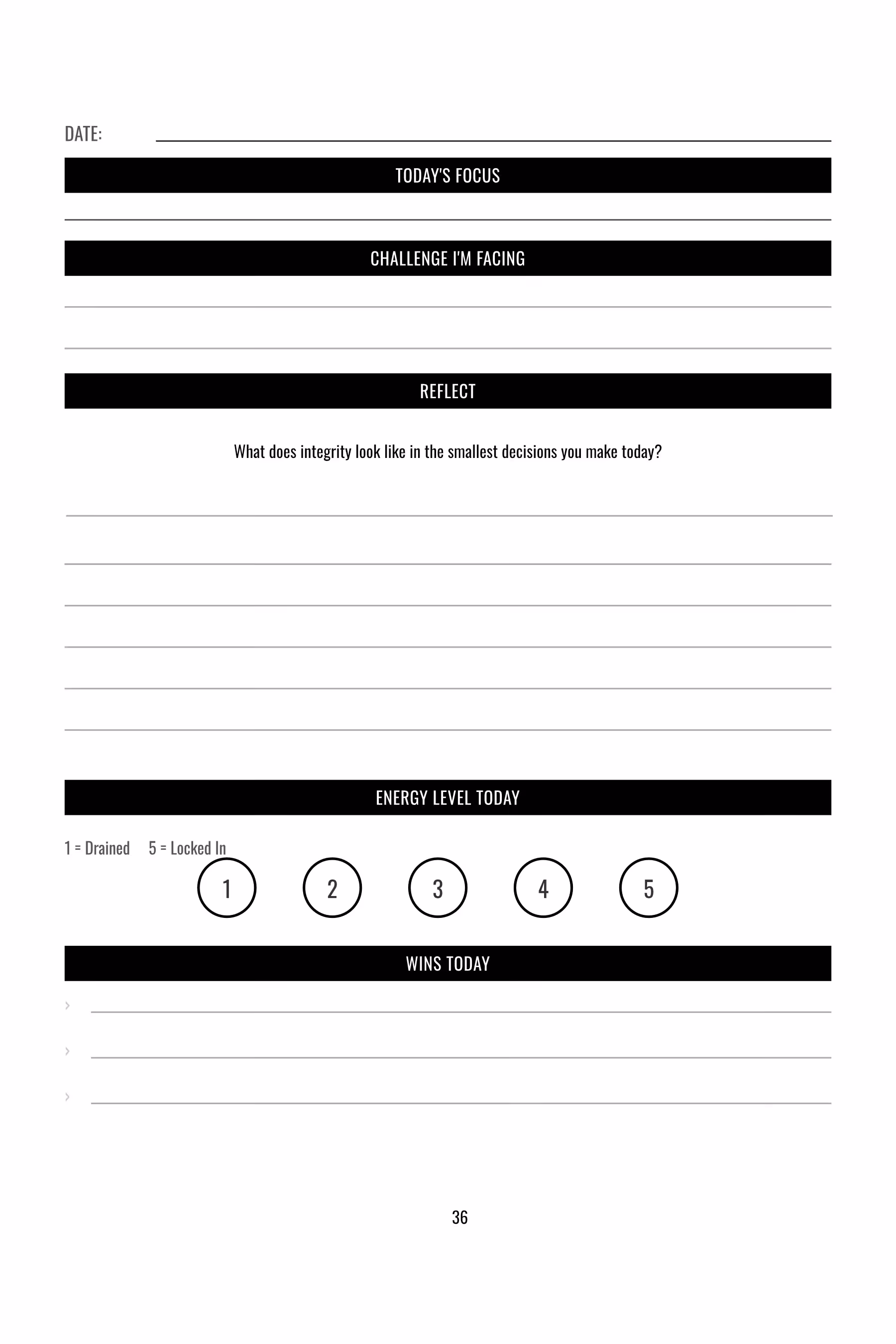 Each daily page opens with a reflection prompt designed to cut through noise and get honest. Work through the sections in order, or go straight to what matters most.