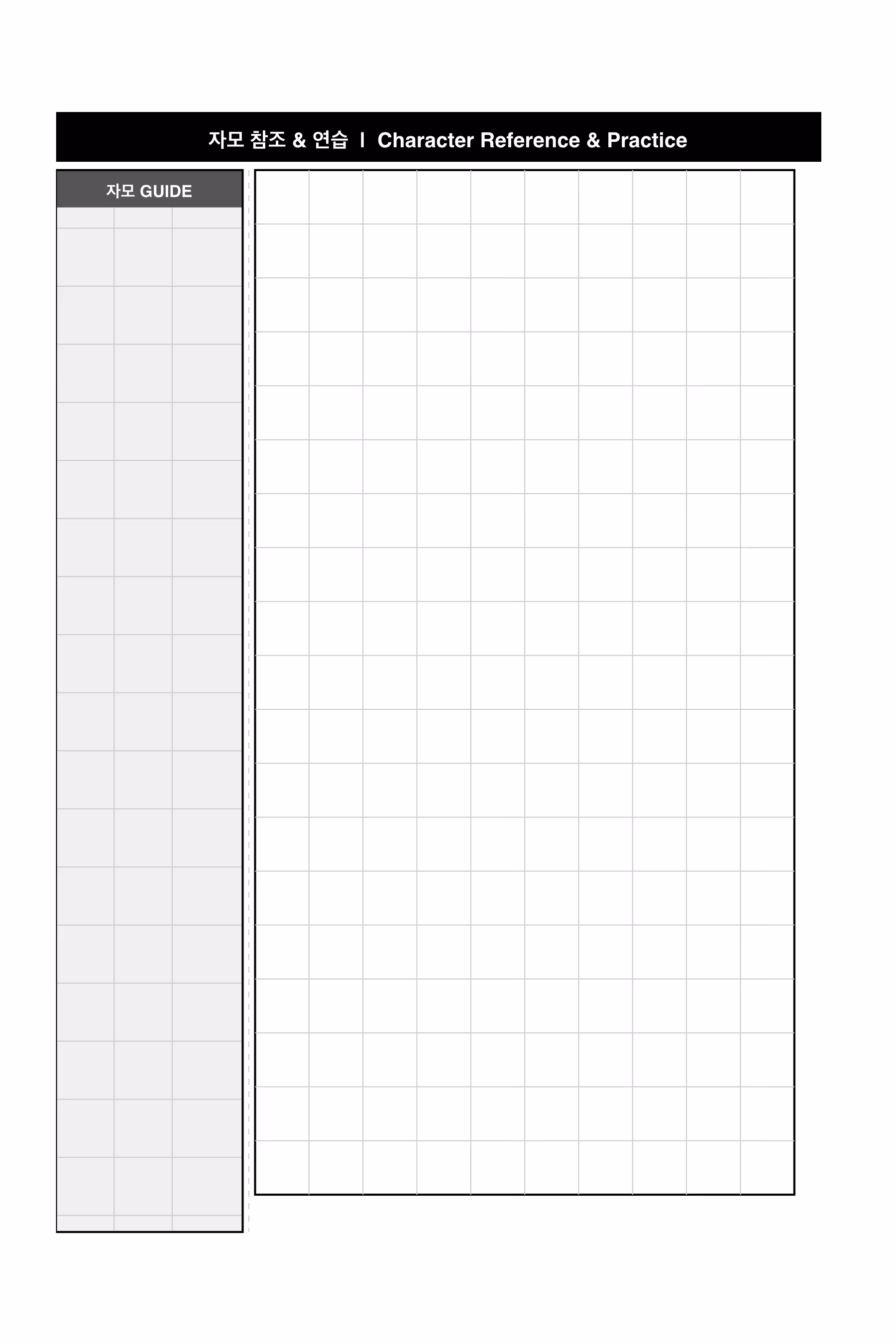 Inside you will find four page types: a 12x12 squared grid page for full character practice, a half-grid half-lined page for practice and notes on the same spread, a blank lined page for free writing, and a character reference sidebar page with a narrow guide column and wide practice area. Use it as your Korean writing practice workbook for structured drills, your Korean practice writing notebook for daily revision, or alongside other Korean study material — the grid format keeps every session precise.