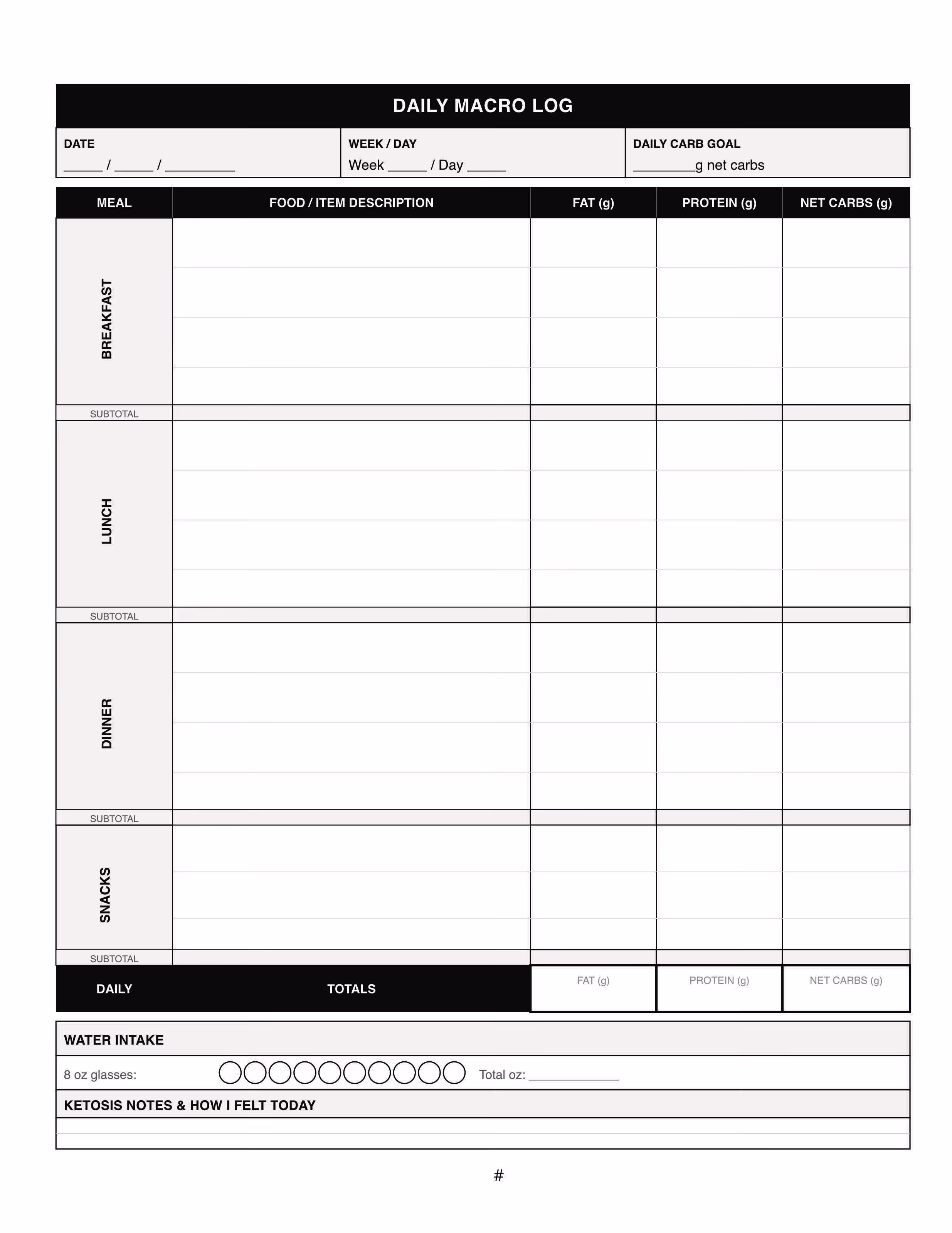 Each week begins with a Weekly Meal Planner page. This full-page grid covers Monday through Sunday, with space to plan three meals plus snacks for every day. Beneath each meal slot, you will find a macro sub-row where you can jot down your planned fat, protein, and net carbs for that entry — and each day column has a totals row at the bottom so you can see your daily macro picture at a glance. Use this page at the start of each week to map out your meals in advance. Planning ahead is one of the most powerful habits in a successful keto lifestyle, and this page makes it easy. You do not have to fill in every cell perfectly — even rough planning puts you miles ahead.