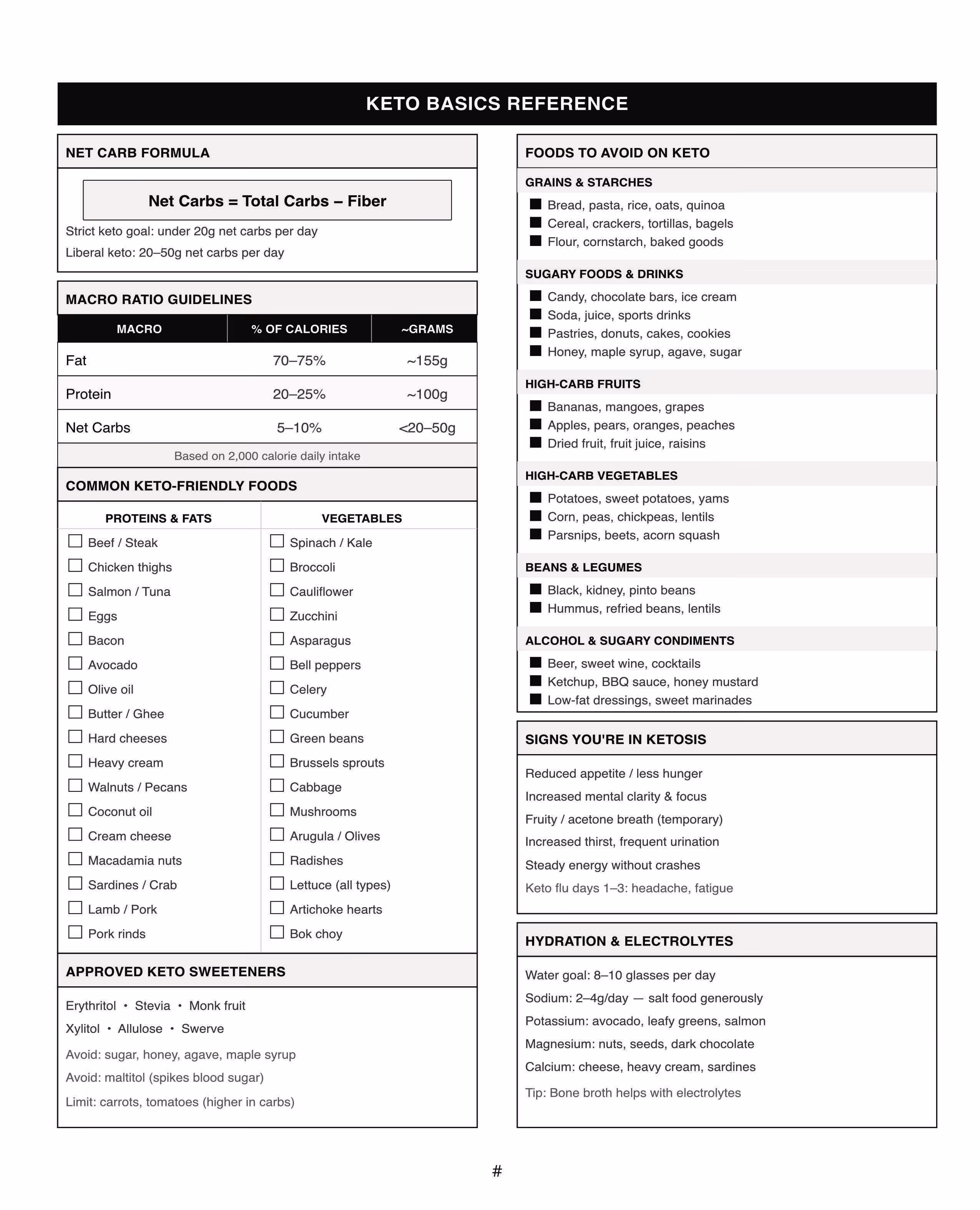 Before you dive into Week 1, take a few minutes to read through the Keto Basics Reference pages at the front of this book. These four pages give you a quick but thorough foundation: the net carb formula you will be using every single day, recommended macro ratio guidelines for ketosis, a list of keto-friendly foods to stock up on, and a clear list of foods to avoid. If you are new to keto, this section will answer most of your beginner questions. If you are experienced, it serves as a handy cheat sheet you can flip back to whenever you need a quick reminder.