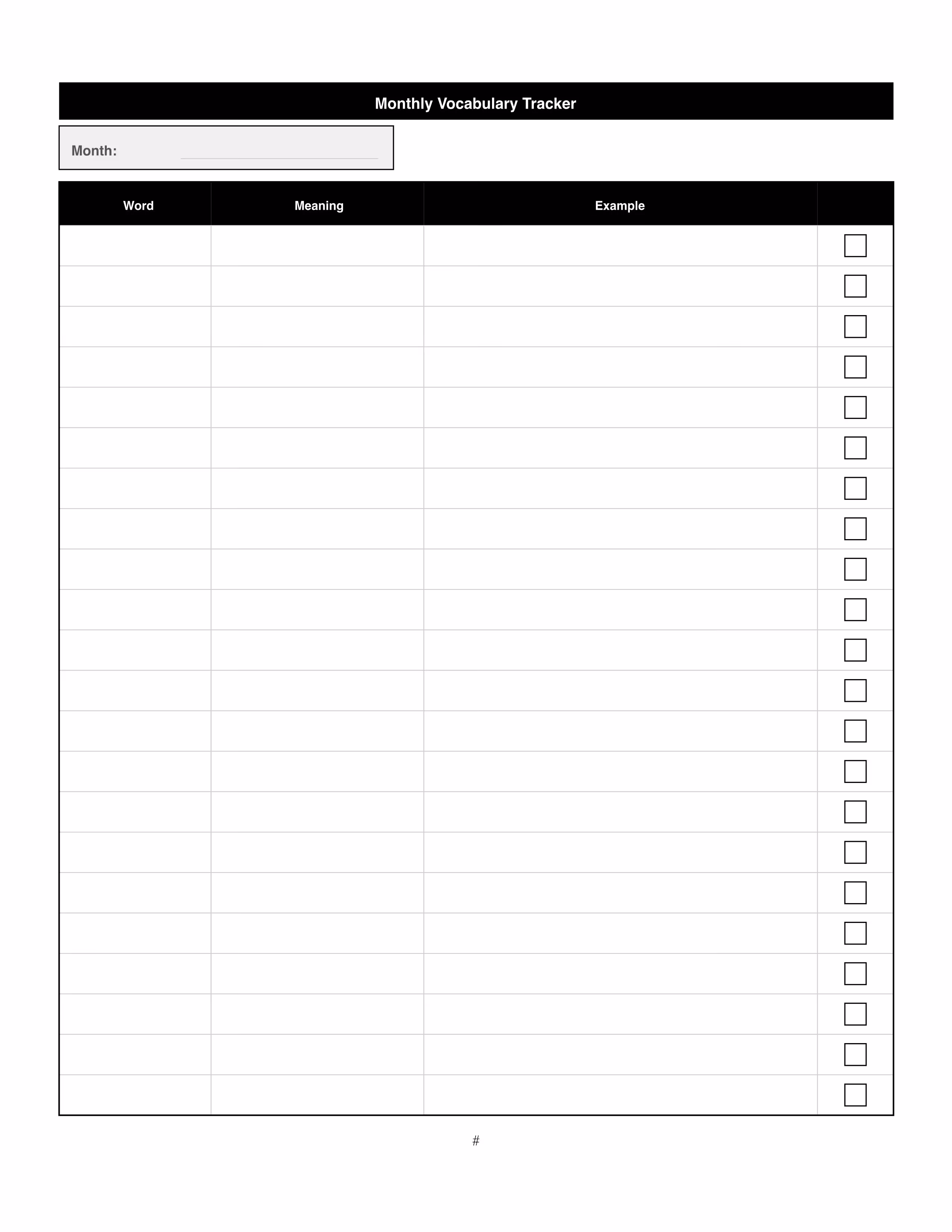 At the end of each month, transfer the words from your daily practice into a Monthly Vocabulary Tracker page. Copy the word, its meaning, and an example sentence into the table. As each word becomes truly familiar to you, check the Done box. Watching that column fill up is one of the most satisfying experiences in language learning — and a powerful reminder of everything you have accomplished.