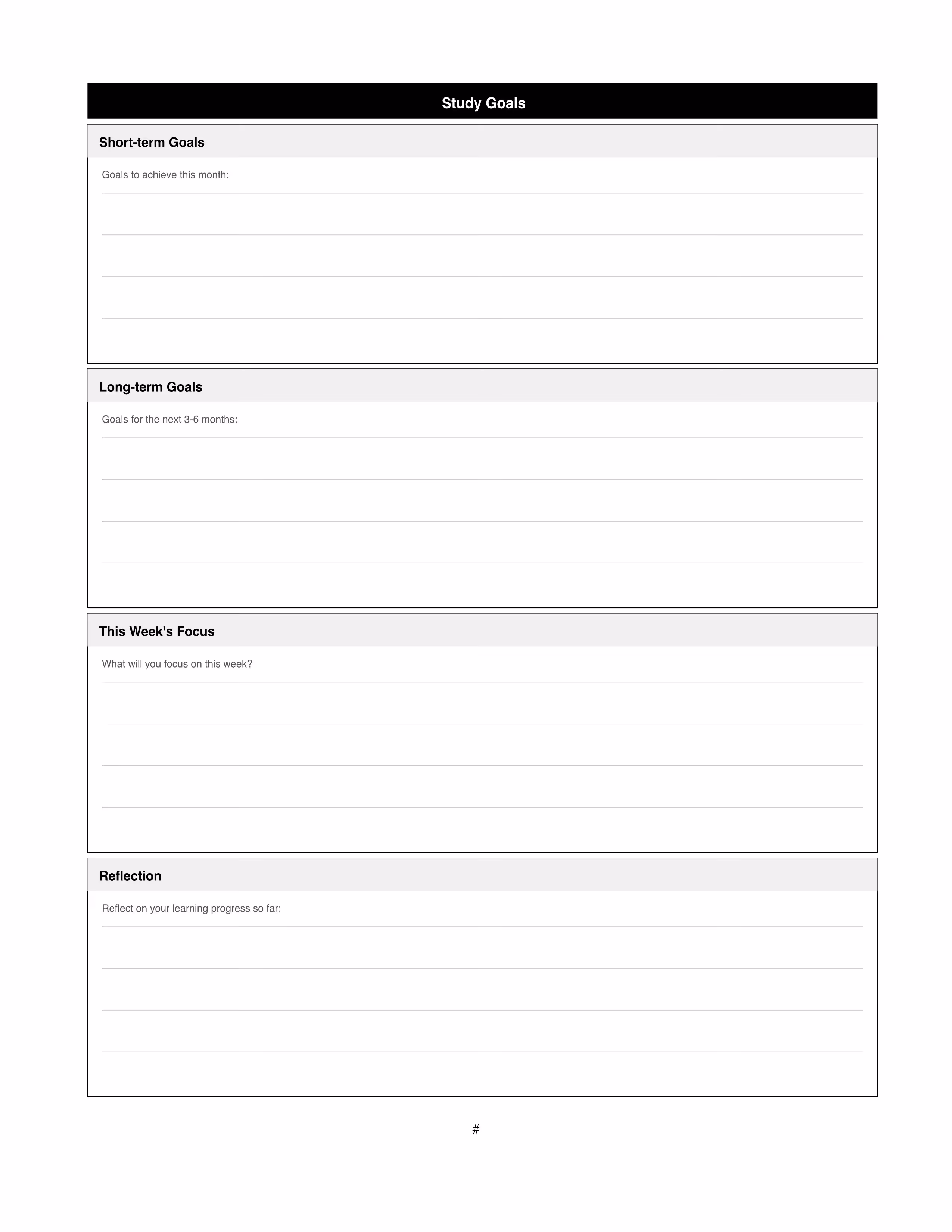 Each week, open a Weekly Study Planner page before your first session of the week. Write your focus topic for each day, the time you plan to study, and any session goals you want to hit. Planning your week before it starts is one of the most powerful habits a self-study learner can develop. It transforms vague intentions into concrete action.
