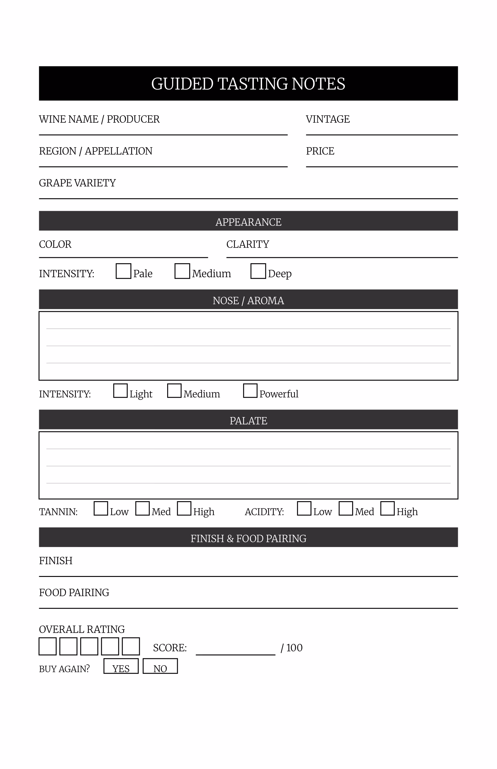 After recording the winery details, turn to the Guided Tasting Notes pages for each individual wine you taste. These structured pages walk you through every layer of evaluation, from the wine's appearance and color intensity to its nose, palate, tannin structure, acidity, and finish. You do not need to be a sommelier to use these pages — simply follow the prompts, check the boxes that feel right, and write in your own words. Over time you will start to notice patterns in the wines you love, the regions that excite your palate, and the producers worth tracking down again. Use the food pairing line to dream up a meal that would complement each bottle, and the Buy Again checkbox