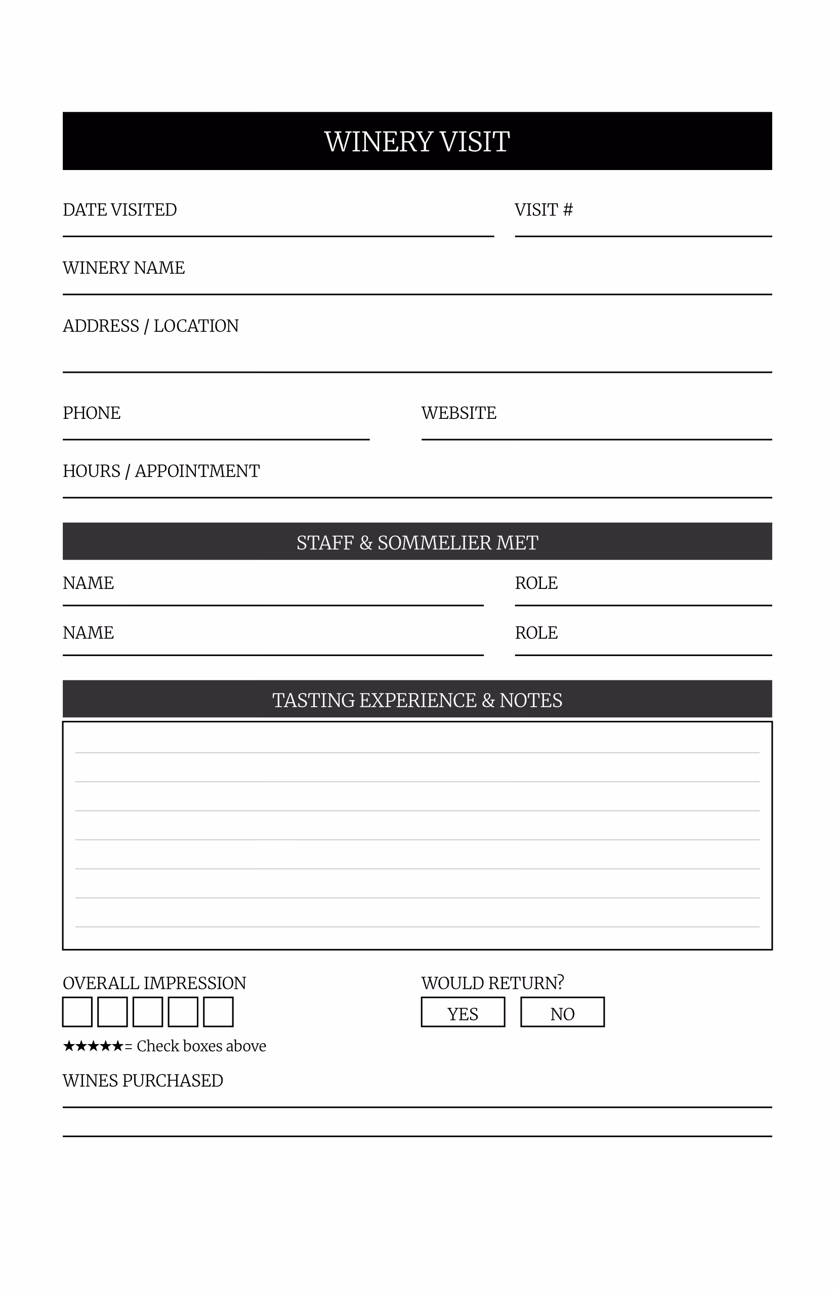 Do not let your winery visits blur together. Use the dedicated visit logs to record location details and the names of staff who made your visit special.