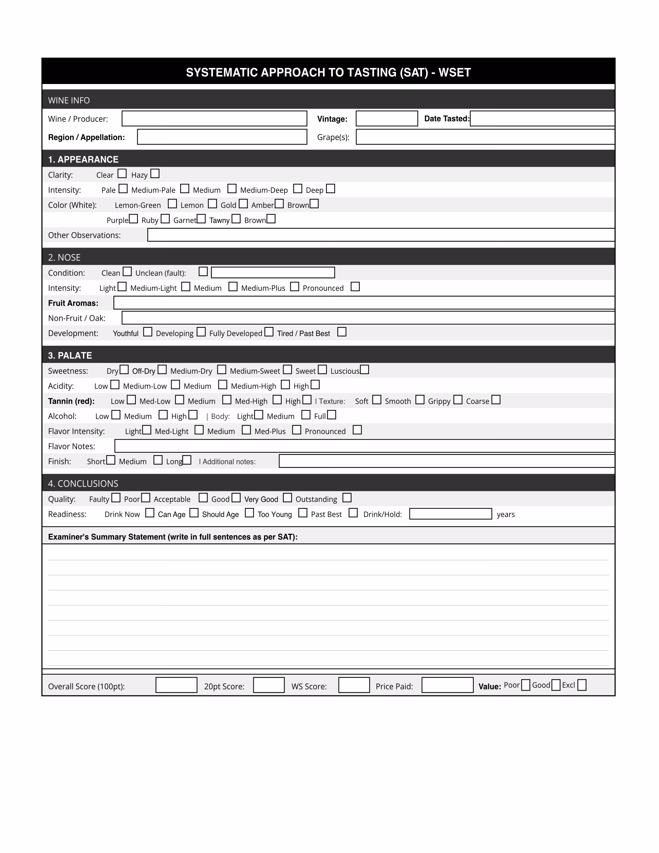 Work through each section from top to bottom. Use the checkboxes to anchor your initial observations, then expand on them in the notes fields. In the Examiner's Summary Statement box, write in complete sentences using formal WSET language — for example: "This wine is clear and deep ruby in colour with a