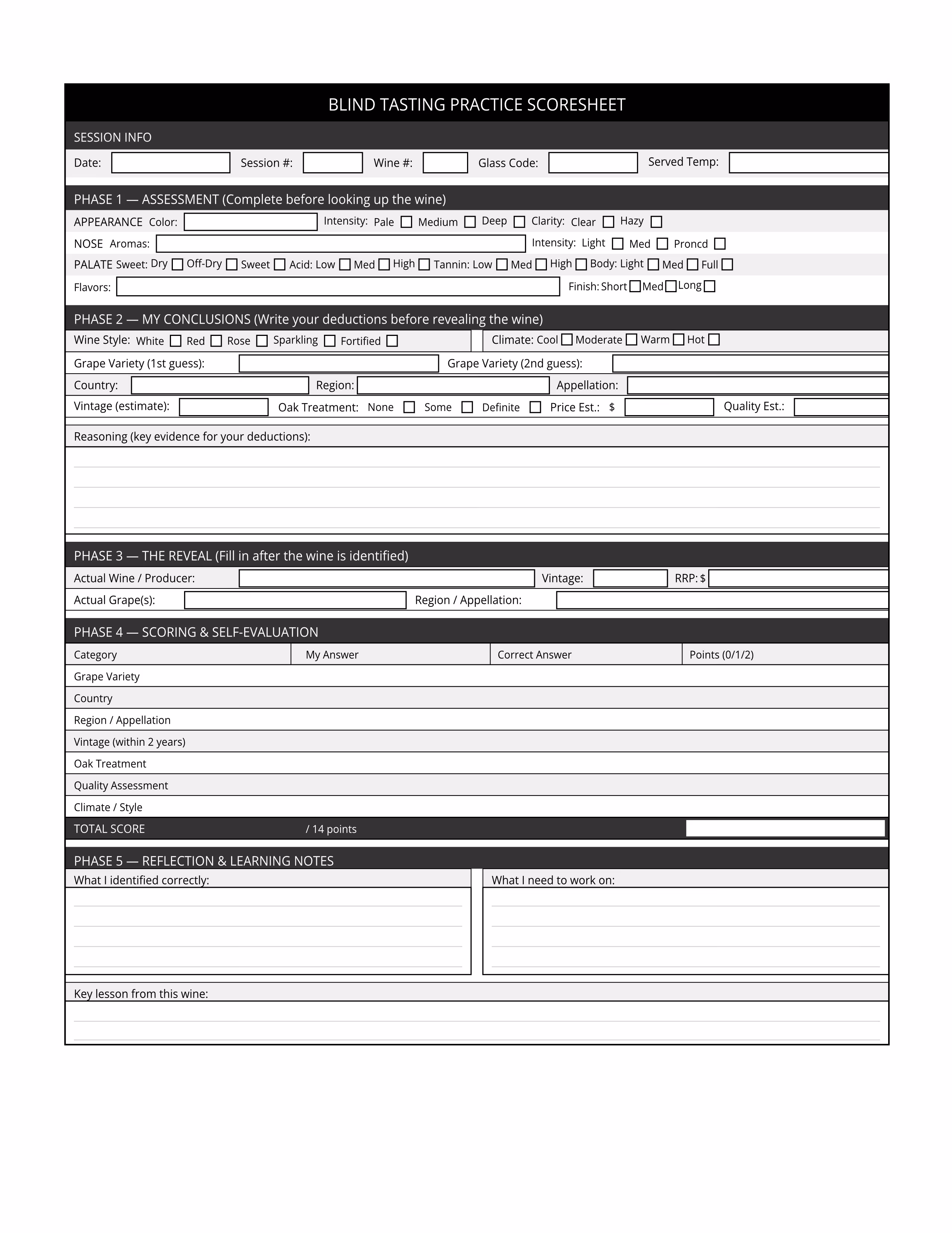 Cover the bottle completely before you begin. Work through Phase 1 and Phase 2 without any hints. Once you have committed your guess in writing, reveal the wine and complete Phases 3, 4, and 5. Be honest with your scoring — the purpose is to identify your pattern of errors, not to flatter yourself. If you consistently